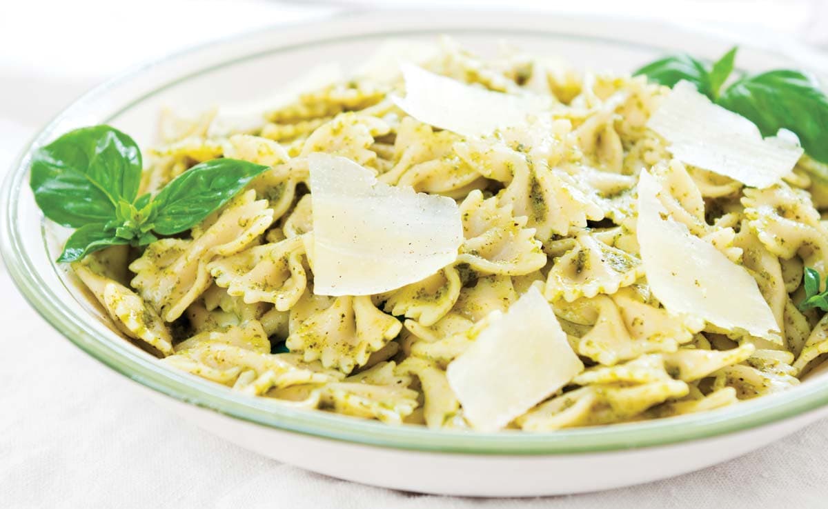Toss pasta with pesto, adding pasta water to smooth the consistency.