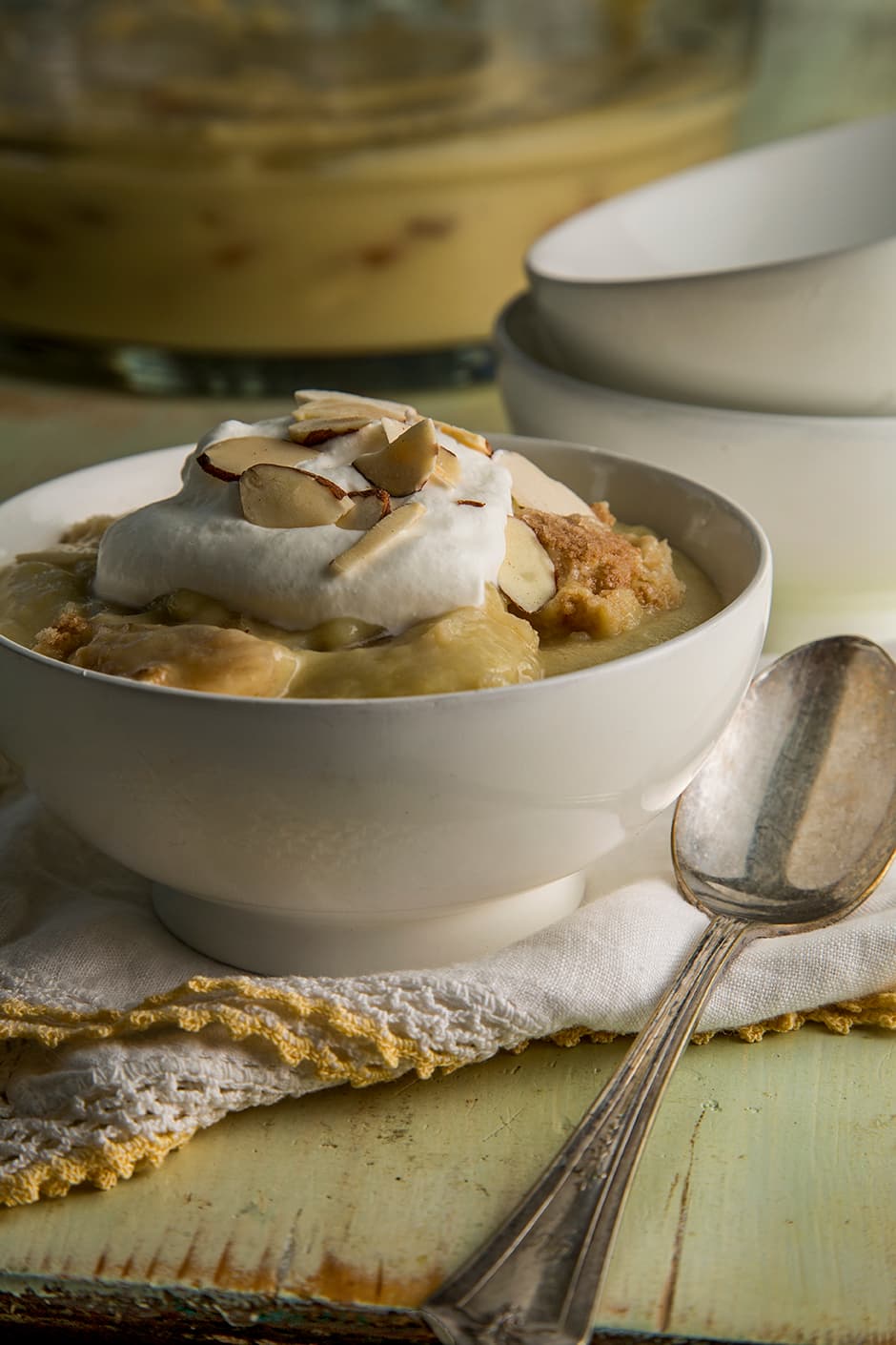 Place a layer of vanilla wafers in a 2-quart bowl and top with a layer of banana slices. Spread 1/3 of the pudding over the top and repeat layers 2 more times. Cover and refrigerate overnight. Top each serving with whipped cream and almonds, if desired. Makes 8 to 10 servings.