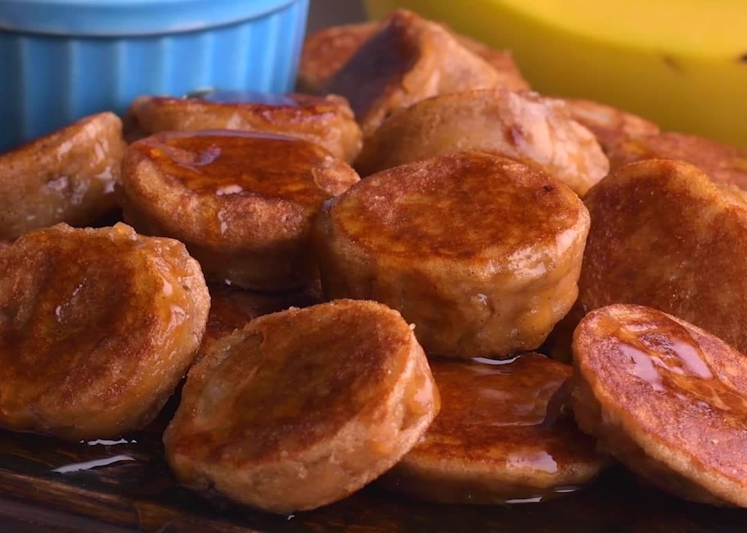 Top banana pancake bites with maple syrup, or dip them in syrup individually.