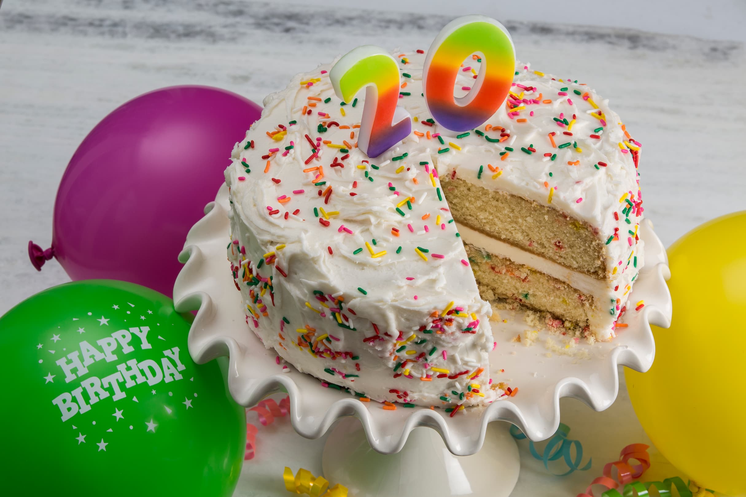 Spread frosting between cake layers and on the sides and top. Finish with sprinkles.