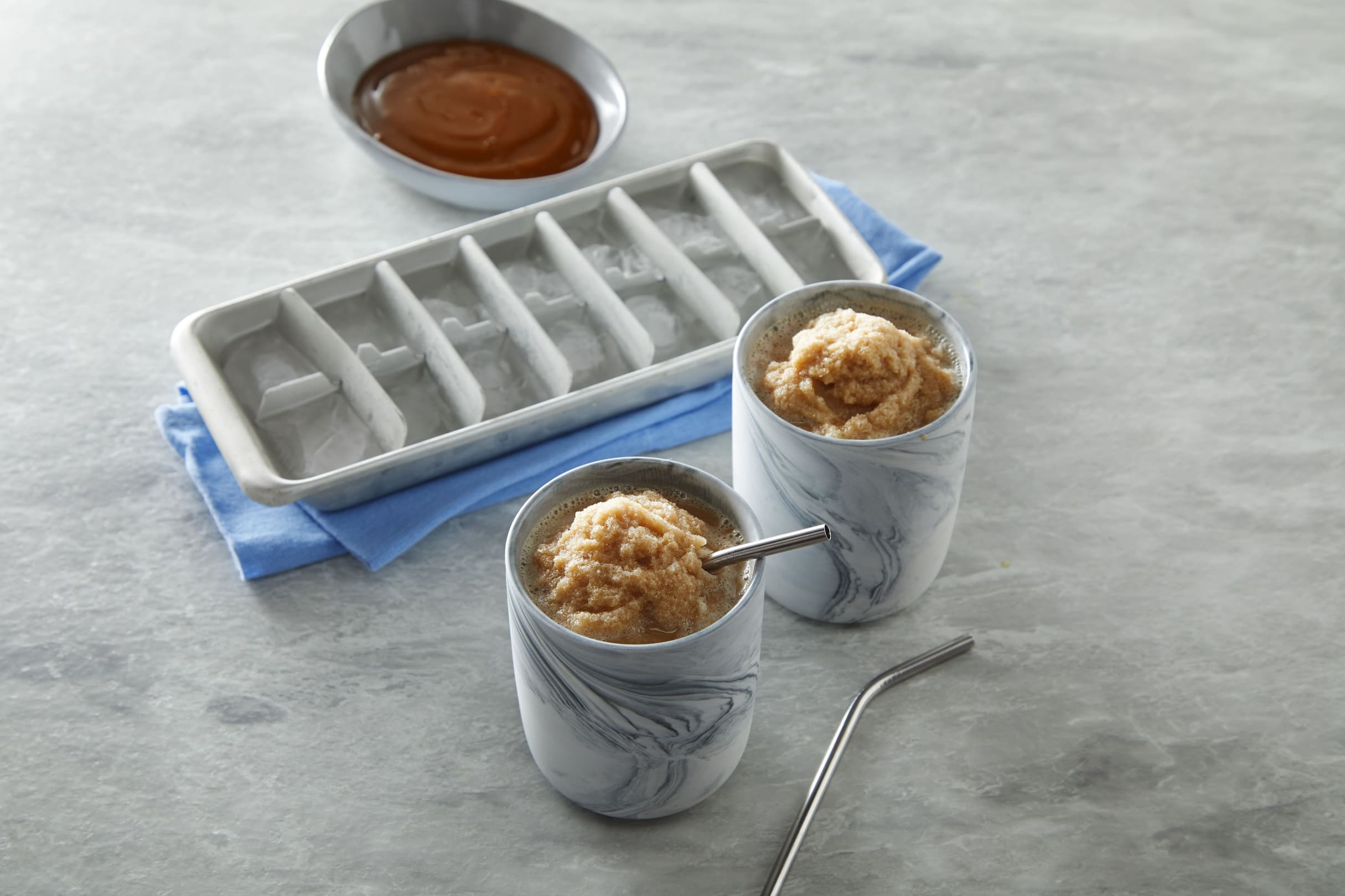 In a blender, add ice, coffee, almondmilk, caramel sauce and vanilla syrup. Blend until smooth and creamy.