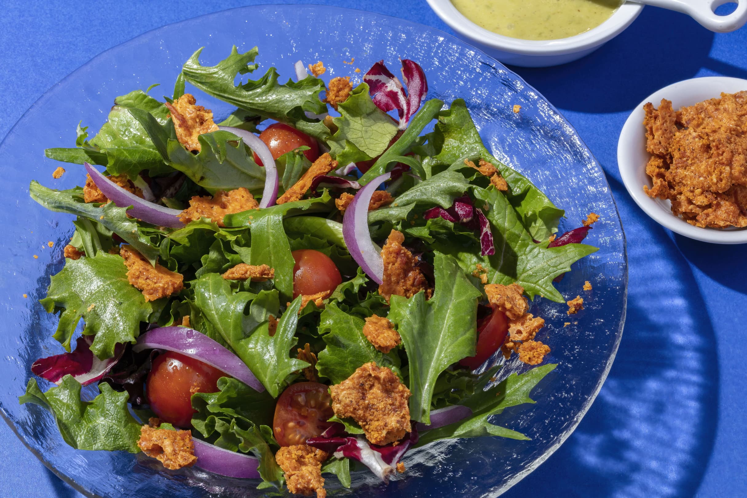 Add tomatoes and onion and lightly toss. Sprinkle with about 1 cup of cheese almond crunch.
