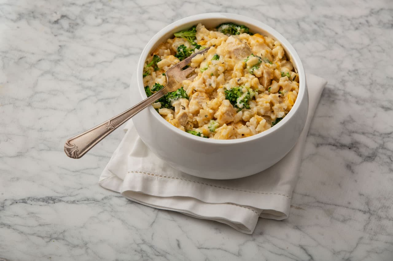 Slow Cooker Method: Coat the bottom of the slow cooker with the butter. Place 3/4 cup Almond Breeze almondmilk, 3/4 cup stock or broth, seasonings and rice in the pot, making sure the rice is completely covered with liquid. Top with chicken and onion. Cover and cook on LOW for 8 hours or on HIGH for 4 hours When cooking is done, stir in broccoli; cover and let stand for 5 minutes. Add cheese, stirring just until melted.