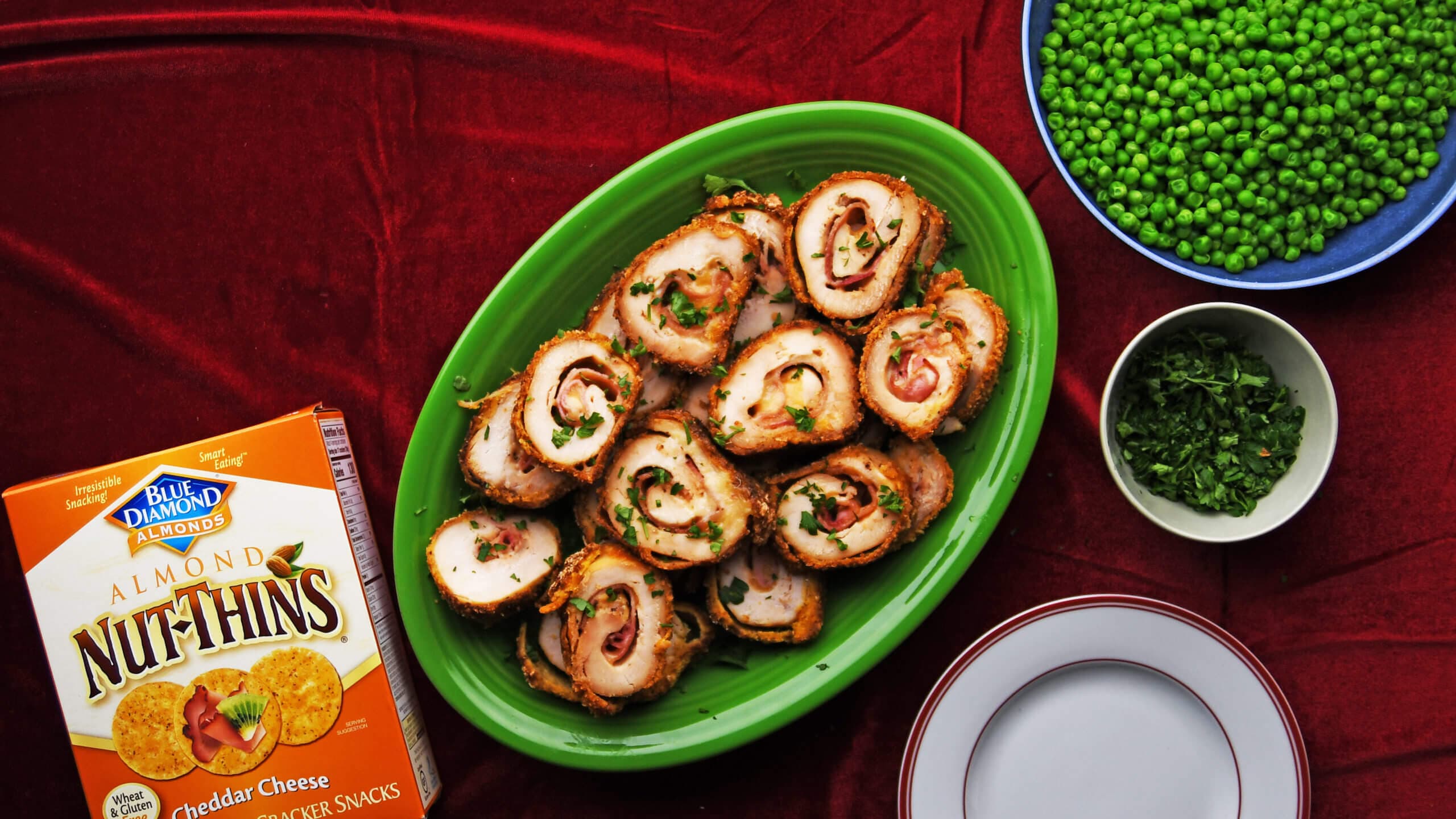 While the chicken chills, pulse the Blue Diamond Nut-Thins® Cheddar Cheese, in a food processor until completely crumbled. Place the crumbs into a bowl, and then fill one other bowl with flour and another one with the whisked eggs.