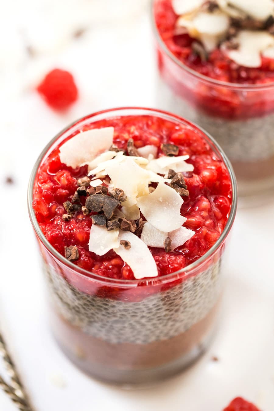 While the mixture is chilling, prepare the mousse. To a blender add the banana, cacao, almond butter and almond milk. Blend on high until smooth and creamy. Transfer this mixture to a bowl and stir in chia seeds. Allow to chill until the chia pudding is ready.