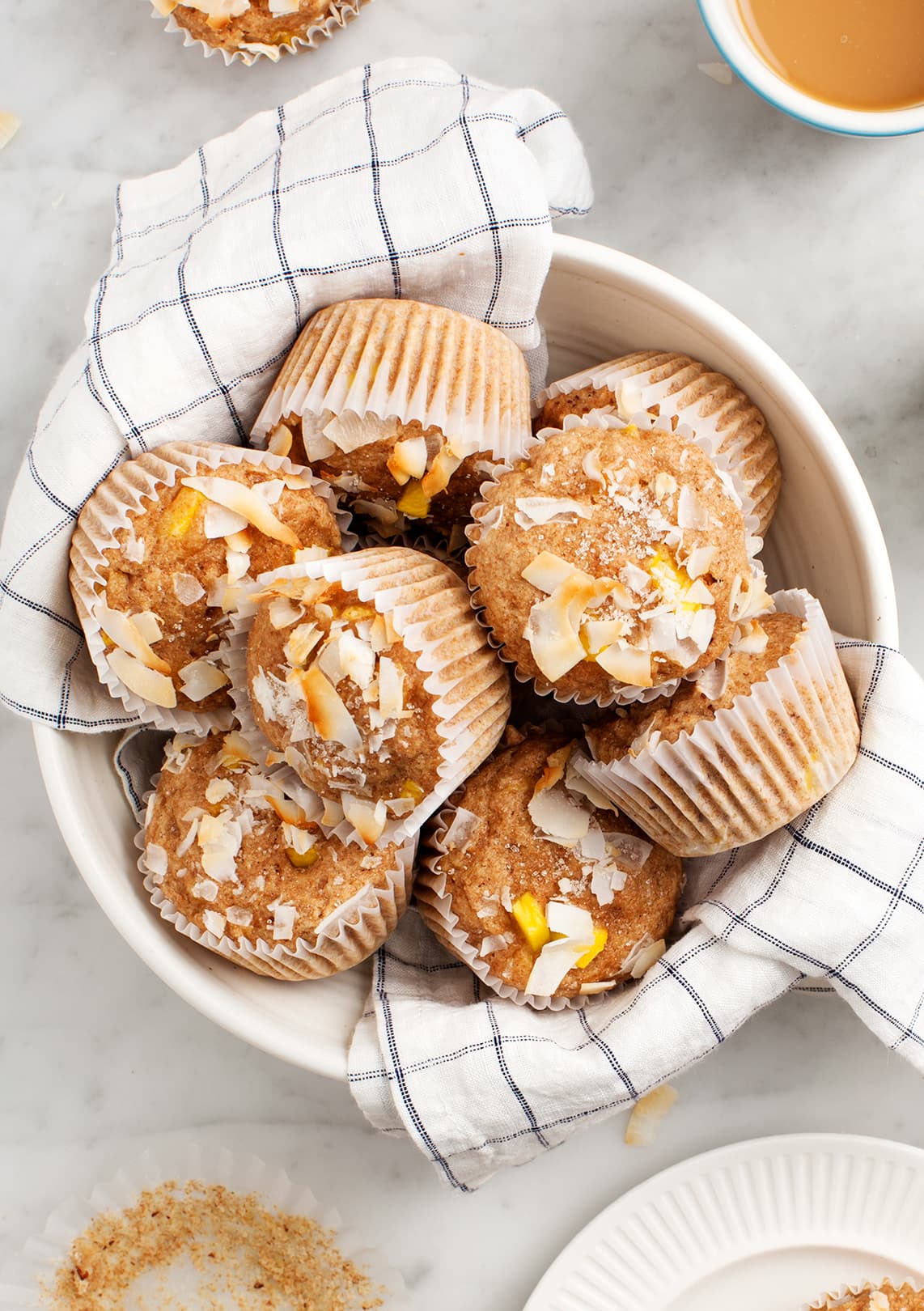 Evenly divide the batter into the muffin cups, filling each about three-quarters full. Sprinkle with the coconut flakes and bake for 15 to 20 minutes, or until a toothpick inserted comes out clean.