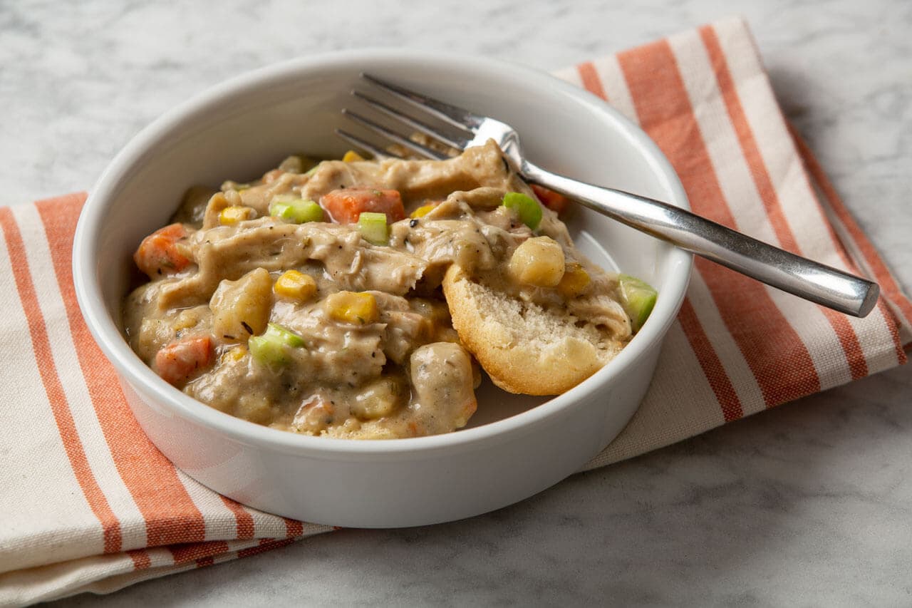 Add chicken to pan and cook, covered, for 5 minutes more or until heated through. Serve with cooked pie crust pieces, puff pastry squares, crescent rolls or biscuits.