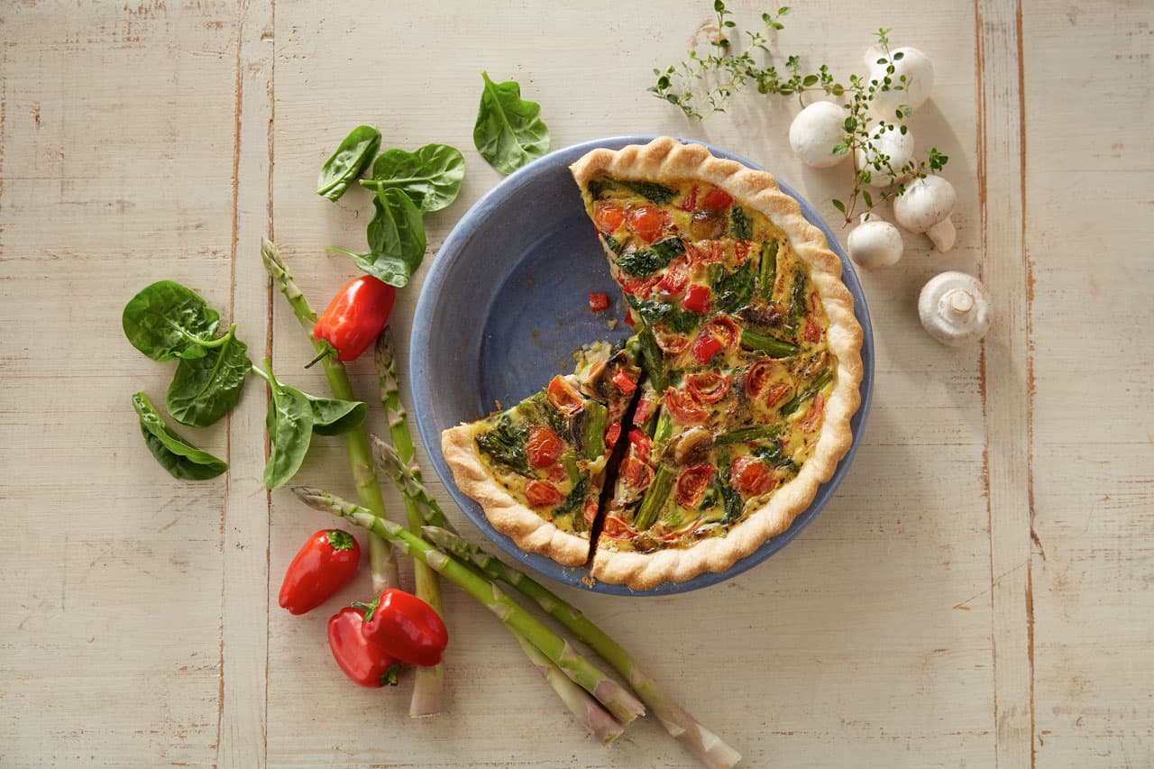 Bake quiche on a baking sheet at 350°F for 40 minutes or until set and a thin knife inserted in the center of the quiche comes out clean.