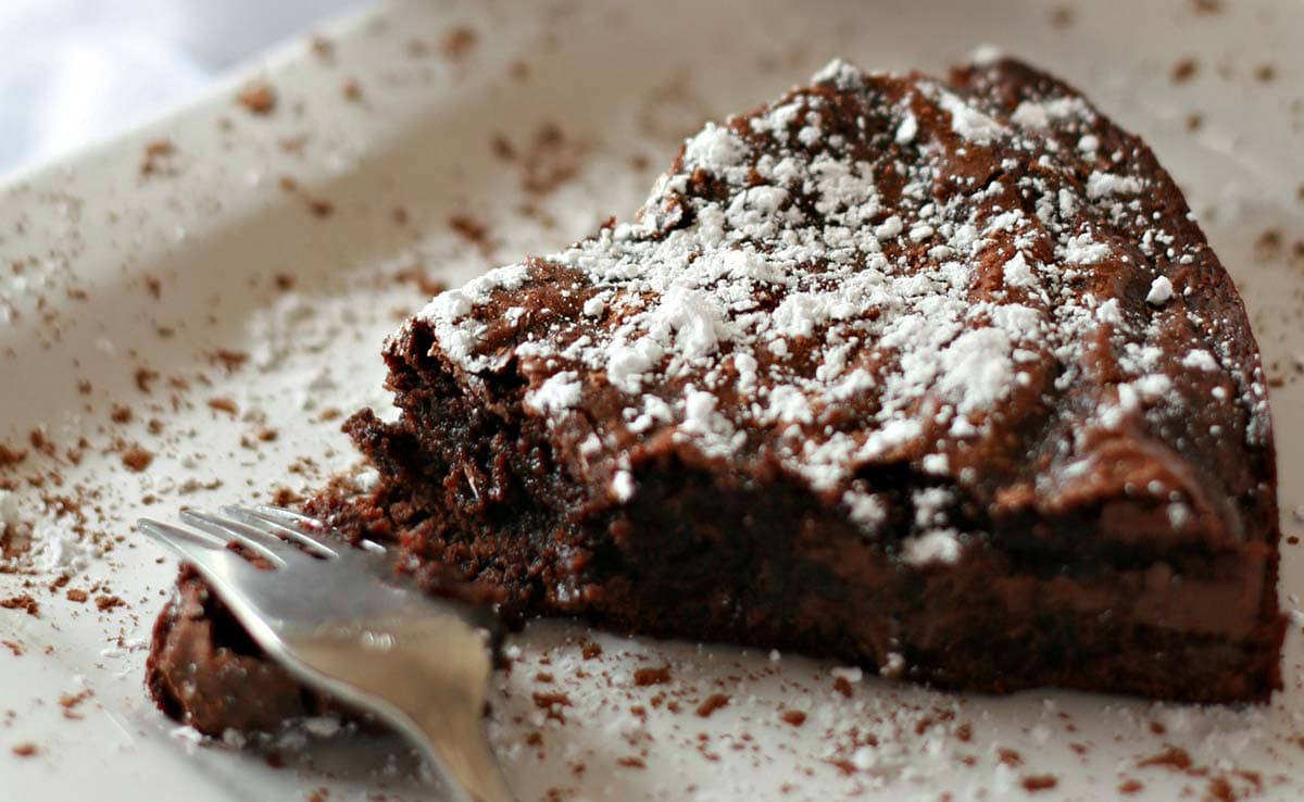 When the cake has cooled, remove parchment. Sift powdered sugar over the crackly top just before serving.