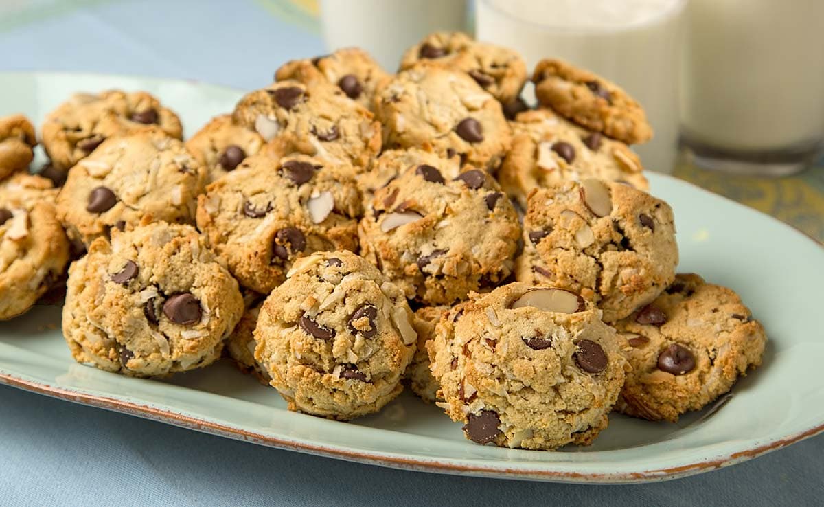 Once dough forms, fold in Blue Diamond Whole Natural Almonds, chocolate chips and coconut flakes.