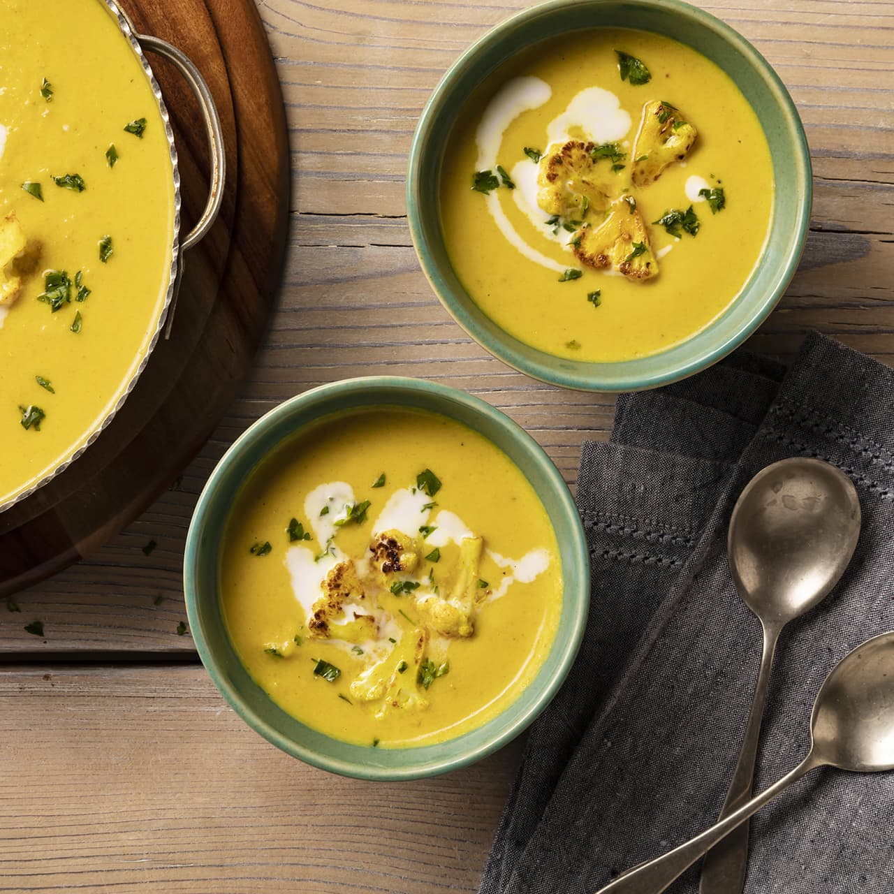 Use a hand blender (or regular blender carefully in batches) and blend until smooth. Salt to taste as needed, stir in coconut milk and serve topped with roasted cauliflower and cilantro with additional coconut milk for drizzling if desired. Makes 4 1/2 cups. Add additional Almond Breeze Unsweetened Coconut Milk for desired consistency.