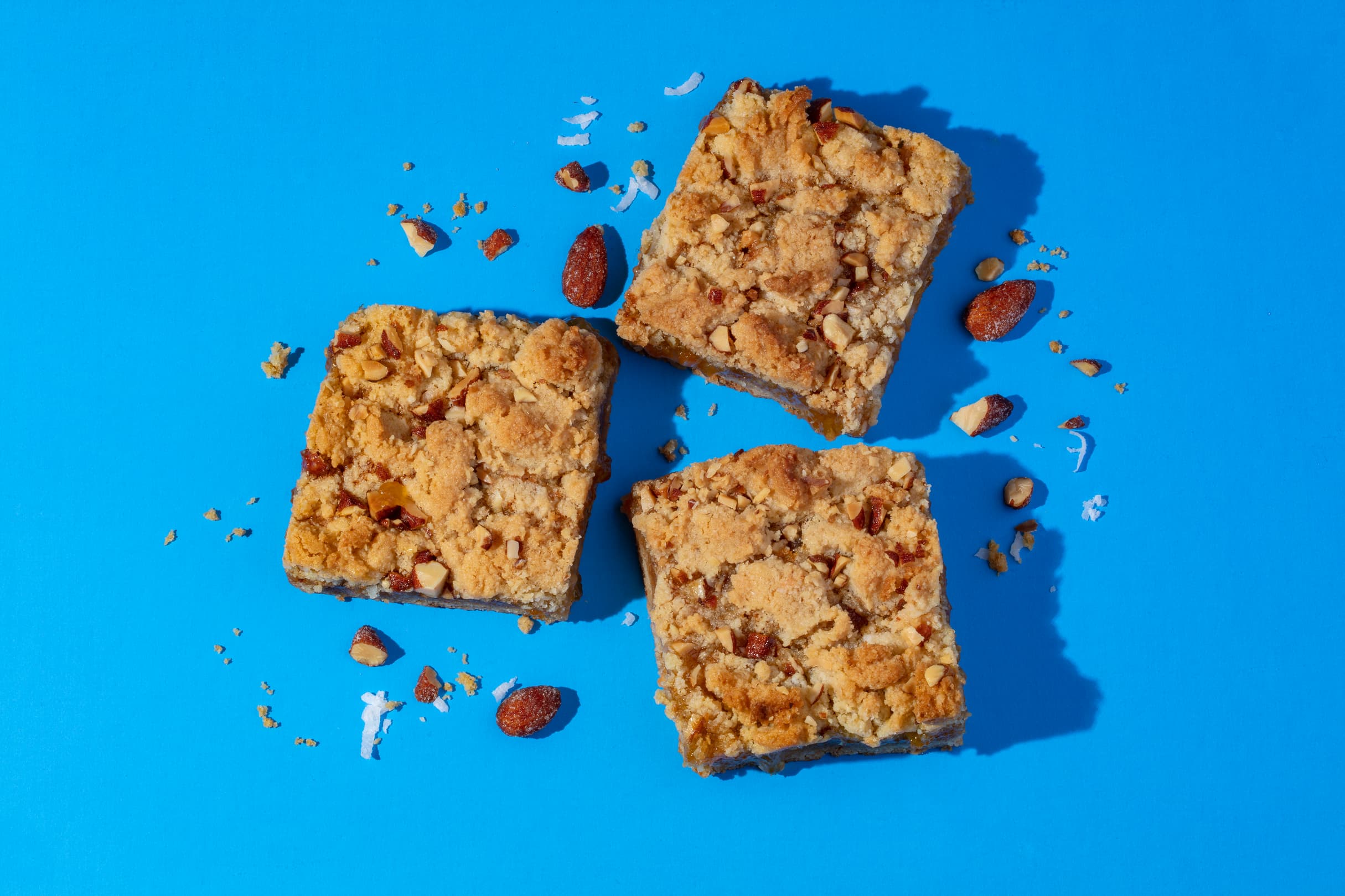 Press about 2/3 of the mixture firmly into the bottom of the baking dish. Spread jam mixture over the top and drop small pieces of the remaining dough over the top; sprinkle with almonds, if desired.