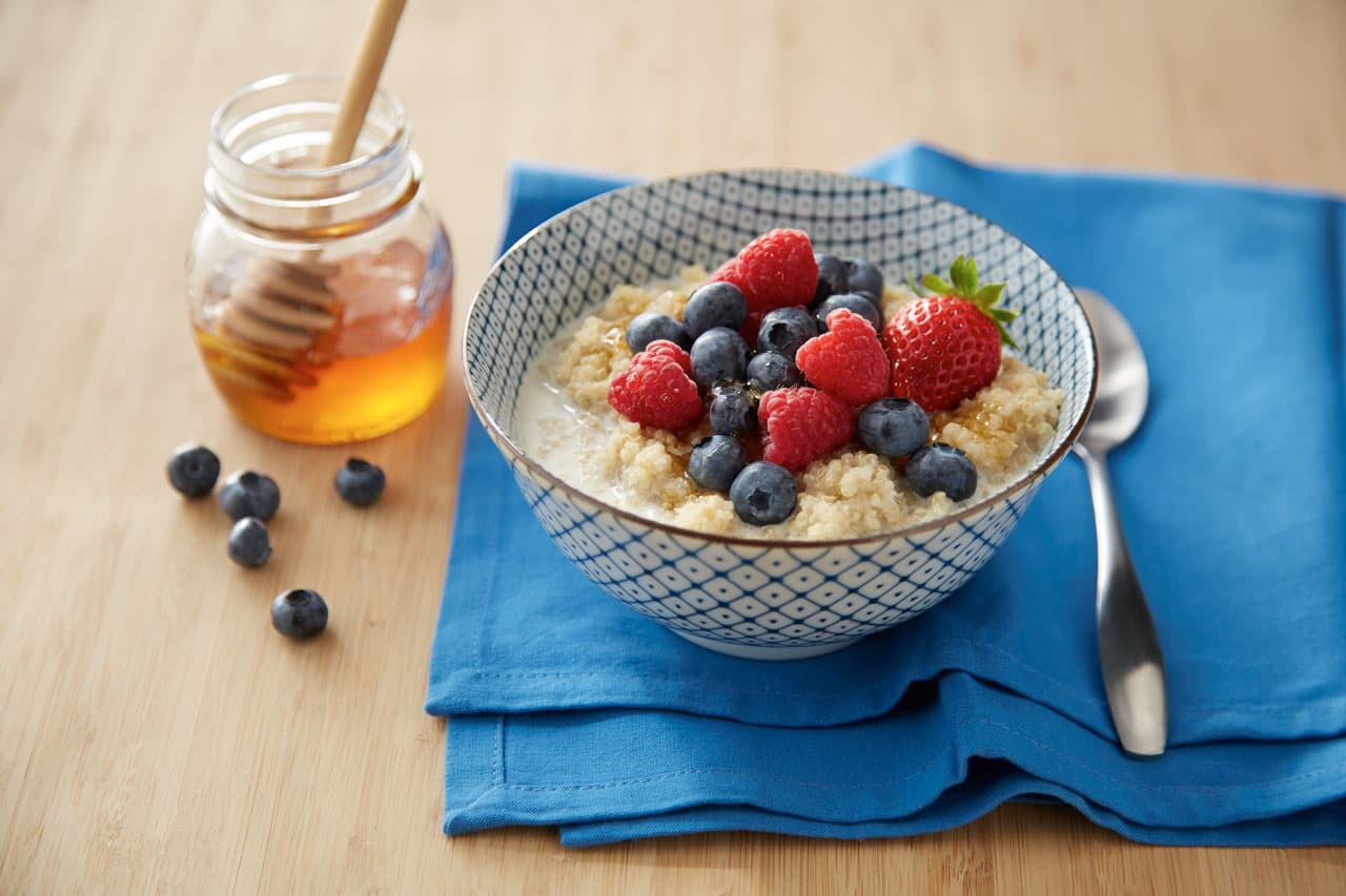 2. Spoon into bowls. Pour a little of the remaining almondmilk over the quinoa. Top with berries and drizzle with honey.